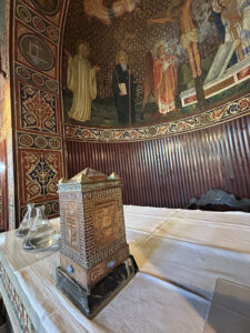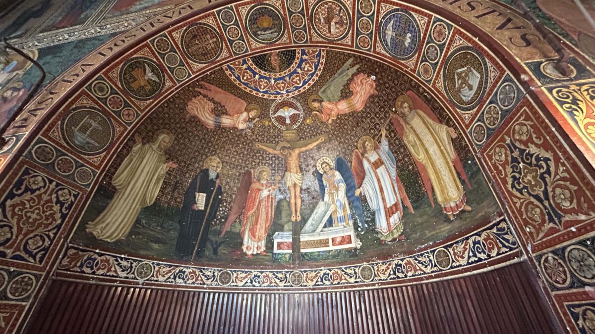 Sulle pareti laterali, secondo un coerente progetto decorativo ricco di simbolismi religiosi, si sviluppano in sequenza da sinistra a destra sedici scene che riprendono i momenti dell’Anno liturgico, a partire dall’Avvento per giungere ai Misteri pasquali e terminare con la Festa dei morti. Sulla parete di fondo, è infine rappresentato il Mistero perenne, con un angelo intento a costruire la chiesa di Dio.