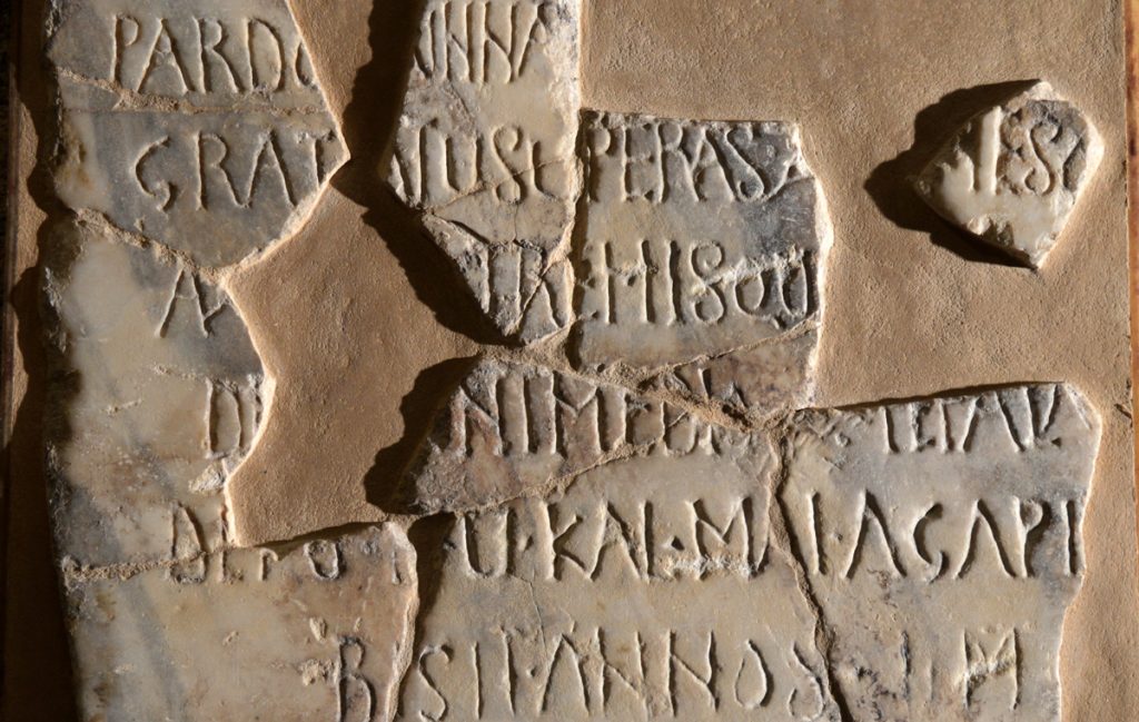 There is a funerary epigraphy in poetic verse dedicated to Paula, a two year old girl that was buried in 517 that can be attributed to this church. The numerous white marble fragments of the epigraphy found during the excavations were recomposed on the right side of the church.